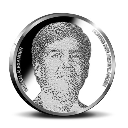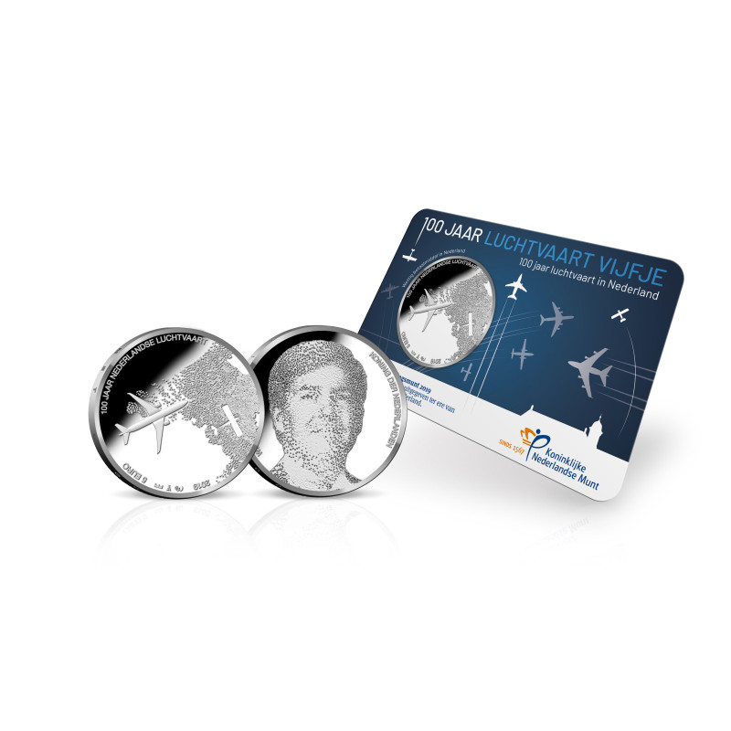 Die versilberte 5-Euro-Gedenkmünze zeigt auf der Vorderseite ein modernes Flugzeug am Himmel aus einer höheren Perspektive. Der Schatten, den es auf die Erde wirft, stammt von einem historischen Flugzeug. Die Rückseite zeigt ein Porträt von König Willem-Alexander, der selbst Pilot ist.
