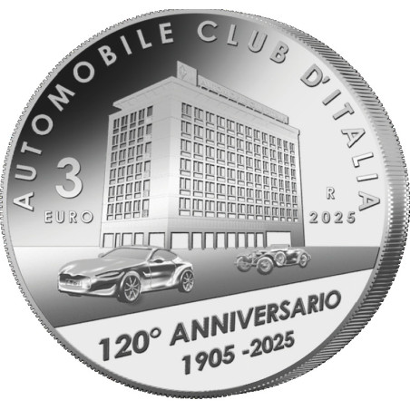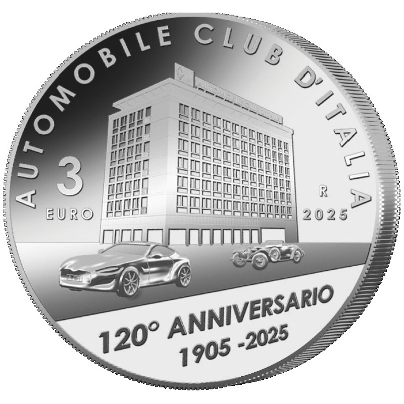 The historic logo of 1905 and the current headquarters in Rome, in a spin of a coin a journey through time to celebrate 120 years of ACI, the “Automobile Club d’Italia”, for over a century a point of reference for motorists and promoter of mobility, road safety and development for the Country. Obverse: In the centre, the historic logo of the Automobile Club d’Italia. Arch-shaped, the inscription “REPUBBLICA ITALIANA”. At the bottom, “V.DE SETA”, the designer’s signature Reverse: In the centre, the ACI building, located in Rome, is depicted overlooking a road travelled by an old car and a modern one, symbolising the commitment of the celebrated organization over time. Arch-shaped, at the top, the inscription “AUTOMOBILE CLUB D’ITALIA”. On the left, “3 EURO”, the coin’s value; on the right, “R”, identifying the Mint of Rome and “2025”, the year of the coin’s issue. At the bottom, the inscription “120° ANNIVERSARIO” and the two dates “1905” and “2025”.