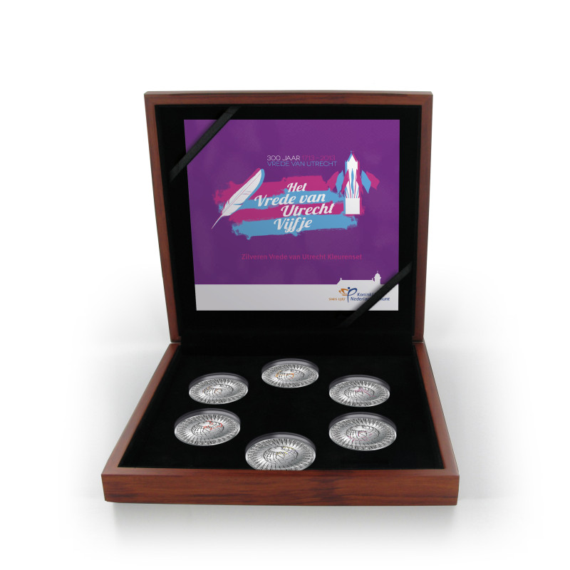 2013 wurde das zweite niederländische Farbset, verpackt in einer schönen Kassette, herausgegeben. Das Thema dieses Satzes ist 300 Jahre Vertrag von Utrecht. Da am Vertrag von Utrecht sechs Staaten beteiligt waren, gibt es in diesem Satz sechs Münzen, die alle ihre "eigene" Farbe erhalten haben.