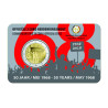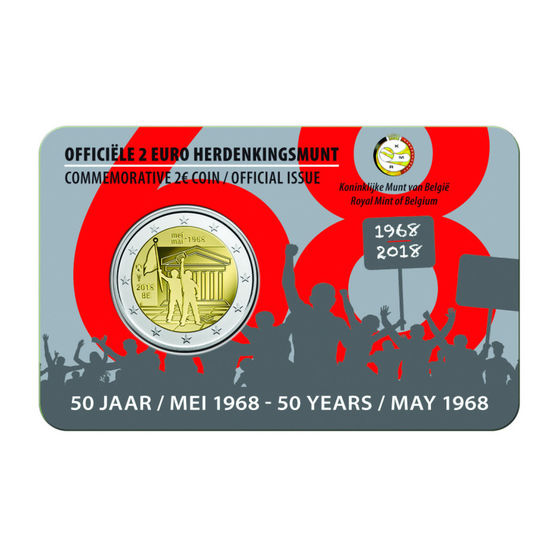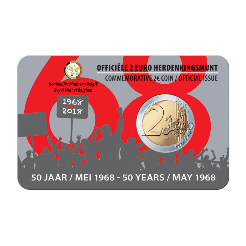 Dies ist die niederländisch/englische 2-Euro-Sondermünze für Belgien 2018. Sie ist dem 50. Jahrestag der Studentenrevolte im Mai 1968 gewidmet. Ein immer noch aktuelles Thema. Es ist auch die erste offizielle 2-Euro-Münze Belgiens, die in Utrecht geprägt wurde. Seit Anfang 2018 werden alle belgischen Euro-Münzen von der Königlichen Niederländischen Münze (KNM) im Auftrag der Königlichen Münze Belgiens geprägt. Dies ist am Münzzeichen des Merkurstabs zu erkennen, das ab jetzt neben dem Münzmeisterzeichen (Wappen der Gemeinde Herzele) von Frau Van Herzele, Münzmeisterin der KMB, steht.