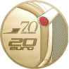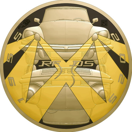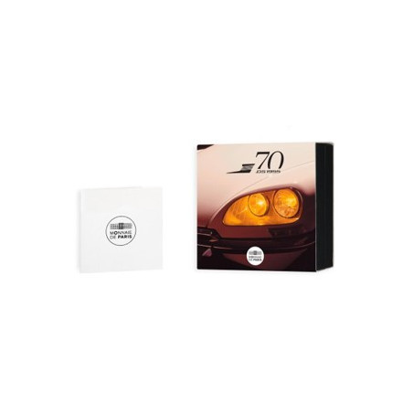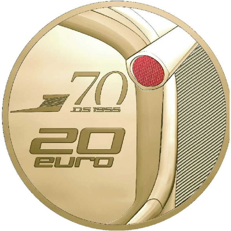 70 years ago, in 1955, the automotive world witnessed a revolution with the arrival of the DS. On the obverse of the coin are two emblematic DS models. In the top part of the design is the DS 23, commercialized from 1975, with its distinctive, avant-garde front end and the last edition to be produced. The pivoting headlights, a first in the automotive history, are highlighted by gold selective deposit. They appear to be following the movement of the road, lighting up the night. The model presented in the bottom part of the design is the first edition, the DS 19, produced starting in 1955. This model is distinguished by its front headlights under a streamlined window and its more modern radiator grille. These two versions symbolize the stylistic evolutions of the DS. The DS 23's directional headlights are accentuated by selective gold deposit for the 10€ Silver Proof coin. There is also a selective black rhodium deposit in the background to highlight the headlights that light up the night on the 10€ Silver Proof coin and the 20€ 1/10 Oz Gold Proof coin. The reverse shows a view of the rear of the car, and more specifically a zoom on the rear indicator at the top of the rear windscreen. A red color enhances this detail on both coins.