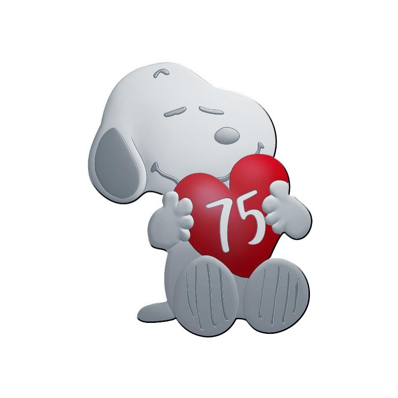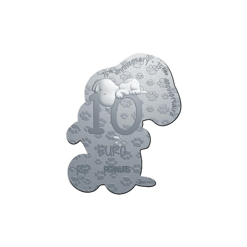 Snoopy is Charlie Brown's dog and the neighborhood favourite. Far from being an ordinary beagle, Snoopy loves to read and write books. He's also a connoisseur of the arts. His overflowing imagination allows him to have extraordinary adventures, all the while staying in his garden near his doghouse. He sometimes sees himself as a World War I aeroplane pilot, as Joe Cool, the king of the campus, or as a world-famous author. Snoopy doesn't speak, but he's good at expressing his emotions. His varied moods, reactions and expressions are just some of the reasons why he's such a touching and much-loved character. These coins take the shape of one of Snoopy's most iconic poses. The beagle smiles fondly as he hugs a heart. The number 75, referring to the anniversary celebrated in 2025, is engraved on the heart. For the first time, Monnaie de Paris is introducing a coloured coin with a red heart for the €10 silver proof coin. On the reverse, against a background engraved with motifs of dog paw prints, Snoopy is nestled on one of the zeros of the face value of each coin and looks at his friend Woodstock perched on the R of the euro.