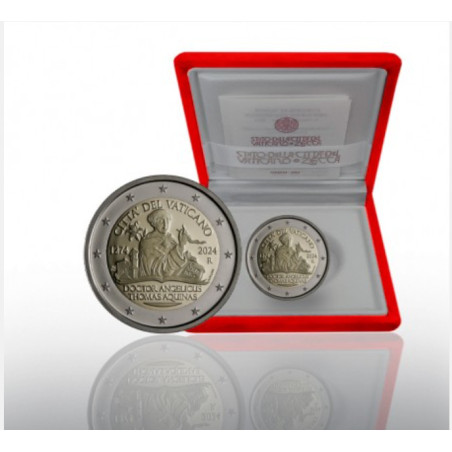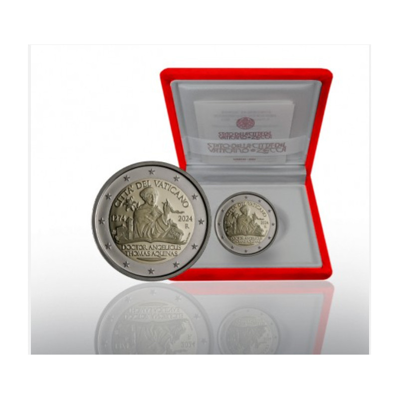 In diesem Jahr jährt sich der Todestag des Heiligen Thomas von Aquin (Roccasecca 1225 ca - Fossanova 1274) zum 750. mal. Die Münze des Vatikans widmet dem Jubiläum die 2-Euro-Bimetallmünze in der Doppelversion Stempelglanz und Proof sowie die 25-Euro-Farbsilber-Rechteckmünze. Auf der Rückseite der 2-Euro-Münze zeigt die Künstlerin Arianna Ciccone den Heiligen Thomas von Aquin im Vordergrund, der den Habit des Dominikanerordens trägt, dem er angehörte. In der linken Hand hält er einen Folianten seines wichtigsten Werks, der "Summa Theologica", in der anderen Hand einen Federkiel. Auf der Brust des Heiligen ist eine strahlende Sonne zu sehen, ein Symbol seiner großen Weisheit. Von den verschiedenen Titeln, die ihm verliehen wurden, ist der des "Engelsarztes", der unten zitiert wird und seine außergewöhnliche Reinheit von Seele und Körper feiert, am bekanntesten. Im Hintergrund auf der linken Seite sind eine Lilie, ein Symbol der Keuschheit, und die Kirche des Heiligen Thomas in Roccasecca zu sehen, das erste religiöse Gebäude der Welt, das zu Ehren des Heiligen Thomas von Aquin errichtet wurde, der am 18. Juli 1323 von Papst Johannes XXII. zum Heiligen ernannt wurde.