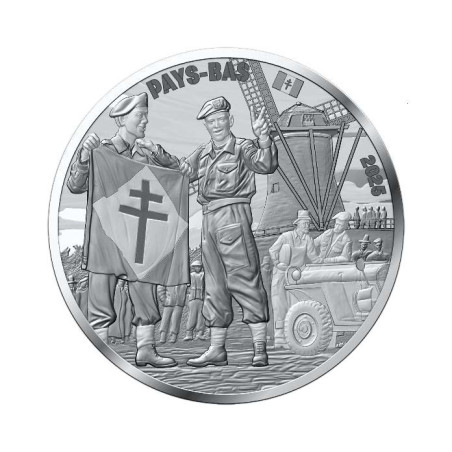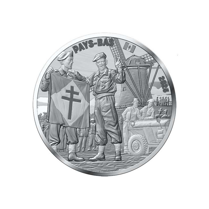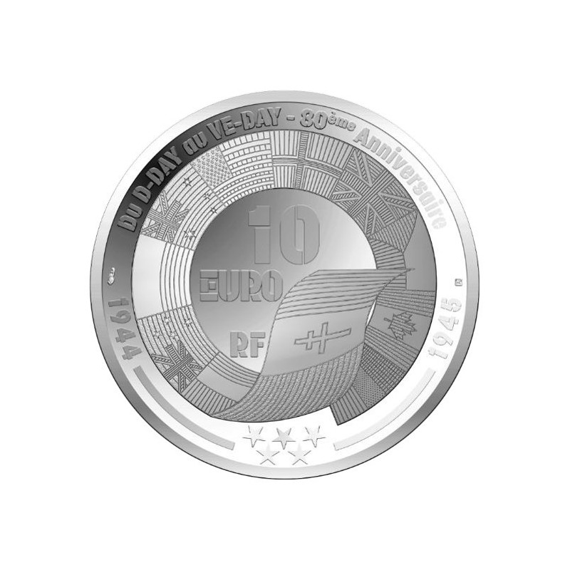 Eleven months after landing on the beaches of Normandy, Allied forces scattered across Europe celebrate the surrender of Nazi Germany. A historic day, “V-E DAY” (or Victory in Europe Day) symbolizes the end of nearly six years of conflict and the return of peace for millions of Europeans. 80 years after this decisive victory, Monnaie de Paris celebrates this historic event by paying a new tribute to the great Allied nations who fought for the liberation of France and Europe. Léon, Second-Maître (Petty Officer) of the Kieffer. Commando, was one of the 177 Frenchmen who took part in the Normandy landings. After D-Day, he took part in the Battle of Normandy until August 27th , 1944, when N°4 Commando was put to rest in Great Britain. In November, he returned to the front in the Netherlands with his comrades. He took part in the Walcheren landing and the capture of Vl. The reverse of this coin features all the Allied countries that officially took part in the Normandy landings, surrounded by the face value and the RF initials. Clockwise: France Libre, Netherlands, New Zealand, Poland, Australia, USA, Norway, UK, Czechoslovakia, Canada, Belgium