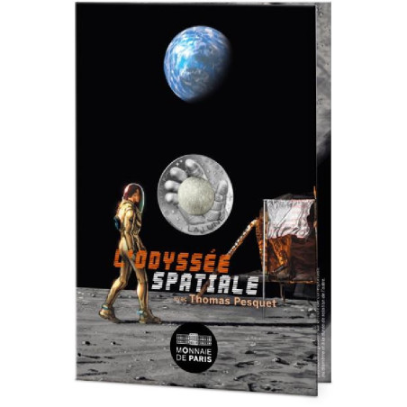 Auf der Vorderseite ist der Mond in der geöffneten Handfläche eines Astronauten dargestellt. Im Hintergrund ist ein Himmel voller Sternen. Diese Gestaltung vermittelt dem Betrachter den Eindruck, er befinde sich im Helm des Astronauten, der den Stern den Stern zu ergreifen, um ihn zu bewundern. Am Rand der Münze stehen die Worte "3.475 km" und "27,3 Tage", die die den Durchmesser des Mondes und die Dauer seines Umlaufs angeben. Zum ersten Mal hat die Monnaie de Paris eine Münze mit eine Münze mit phosphoreszierendem Motiv in ihre Sammlungen aufgenommen. Der Mond leuchtet in der Dunkelheit, nachdem er nachdem er dem Licht ausgesetzt wurde. Auf der Rückseite ist der Nennwert von zwei Zweigen umgeben, einem Eichenzweig und einem Lorbeerzweig, die an das Euro-Symbol. Die gesamte Rückseite wird von der Aufschrift "République Française" und einer Reihe von Linien umrahmt, die das das Sechseck. Die Münze ist in einem Kärtchen mit Motiven von Romain Hugault verpackt. Im Inneren befinden sich wissenschaftliche Details über den Satelliten und auf der Rückseite ein Text von Thomas Pesquet.