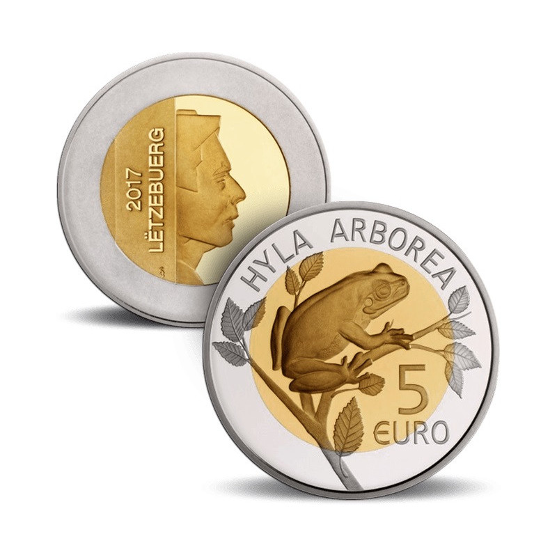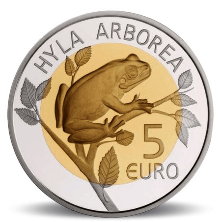 Diese 5-Euro-Gedenkmünze aus Luxemburg hat einen Ring aus glänzendem Sterlingsilber mit einem Kern aus nordischem Gold in der Mitte. Auf der Münze ist der Europäische Laubfrosch mit großer Finesse und einem kleinen Teil seines Lebensraums abgebildet. Oben auf der Münze steht der lateinische Name HYLA ARBOREA. Da die Münze in der höchstmöglichen Sammlerqualität geprägt wurde, sind die Details besonders gut zu erkennen.