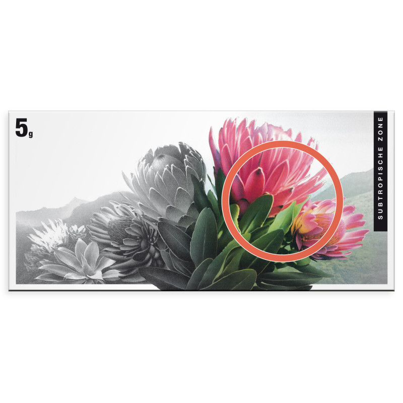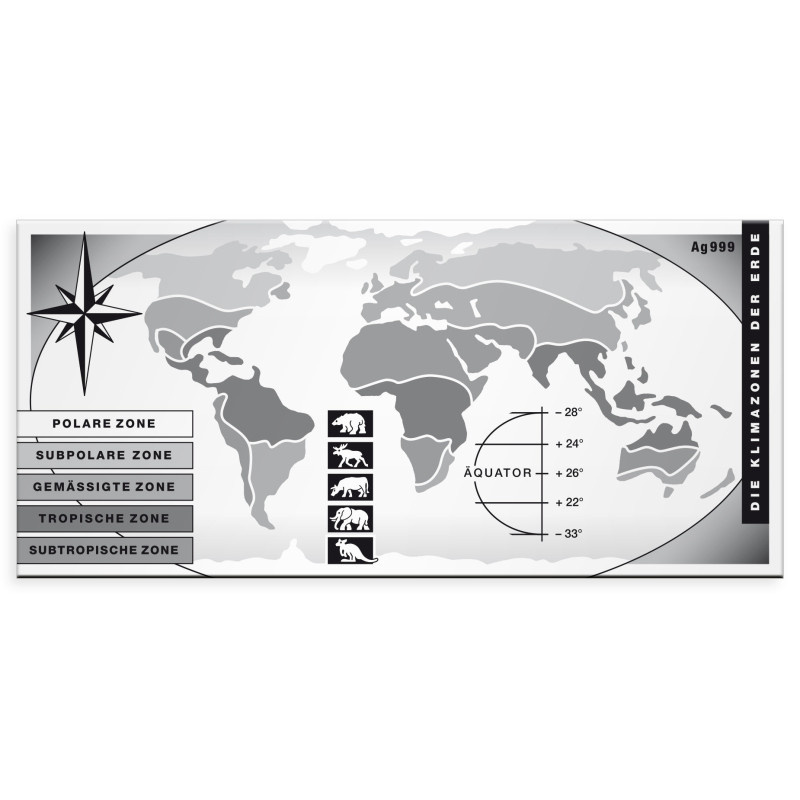 Das Set enthält alle fünf Flat Bars der Serie "Subtropische Zone". Diese reinen Silber-Gedenkausgaben zeigen die Antilope, den Bengalischen Tiger, das Känguru, den Tukan und die Protea (auch Zuckerbusch genannt). Auf der anderen Seite jeder Ausgabe sehen wir die Weltkarte mit allen Klimazonen in verschiedenen Grautönen. Für jede Zone ist ein großes Säugetier abgebildet. Von oben nach unten sind das der Eisbär, der Elch, das Rind, der Elefant und das Känguru. Oben rechts steht der Silbergehalt „Ag 999“ und vertikal der Text „DIE KLIMAZONEN DER ERDE“.