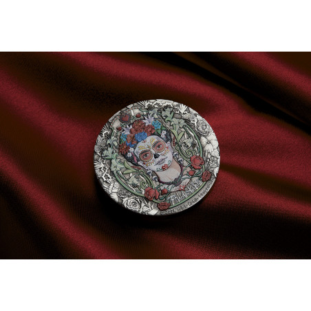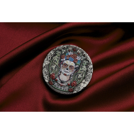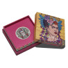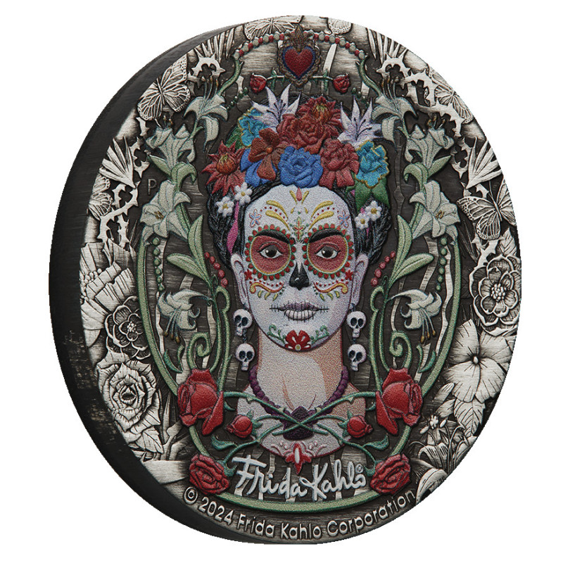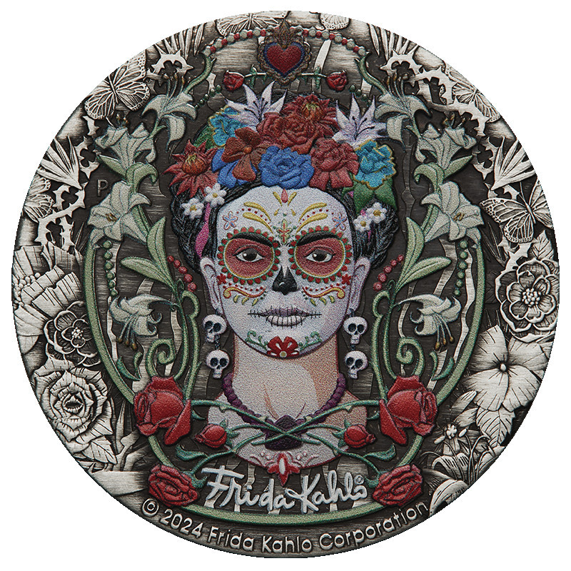Die Perth Mint freut sich, diese atemberaubende antikisierende Silbermünze zu Ehren einer der größten Künstlerinnen Mexikos, Frida Kahlo, herauszugeben. Frida Kahlo ist bekannt für die Verwendung leuchtender Farben. Ihre Gemälde werden für ihre Aufmerksamkeit gegenüber der mexikanischen und indigenen Kultur gefeiert und allgemein für ihre Darstellungen der weiblichen Erfahrung und Form bewundert. Zu ihrem Werk gehören viele Selbstporträts, die den schrecklichen Schmerz und das Leid widerspiegeln, das sie im Laufe ihres Lebens erfahren hat. Ihre Kämpfe, ihre Leidenschaft für Mexiko und ihr Einsatz für die Rechte der Frauen haben ein Vermächtnis geschaffen, das auch heute noch bei Menschen aus allen Gesellschaftsschichten Anklang findet. Ihr Stil entzieht sich einer einfachen Kategorisierung und wird als surrealistisch oder als magischer Realismus bezeichnet. Trotz dieser Vergleiche ist es unbestreitbar, dass sie auf einzigartige Weise die künstlerische Form durchbrochen hat. Siebzig Jahre nach ihrem Tod zeigt diese Gedenkmünze ein farbiges Porträt der beliebten Künstlerin, das von der Frida Kahlo Corporation erstellt wurde, einer Organisation, die sich der Aufklärung, Verbreitung und Bewahrung ihres Vermächtnisses und ihres Images widmet. Die aus 2 oz 99,99 % reinem Silber geprägte Münze wird als gesetzliches Zahlungsmittel unter der Aufsicht der Regierung von Tuvalu ausgegeben. Mit einer limitierten Auflage von 3.000 Stück ist die Frida Kahlo 2024 2oz Silver Coloured Antiqued Coin ein Muss für Kunstliebhaber und Sammler gleichermaßen.