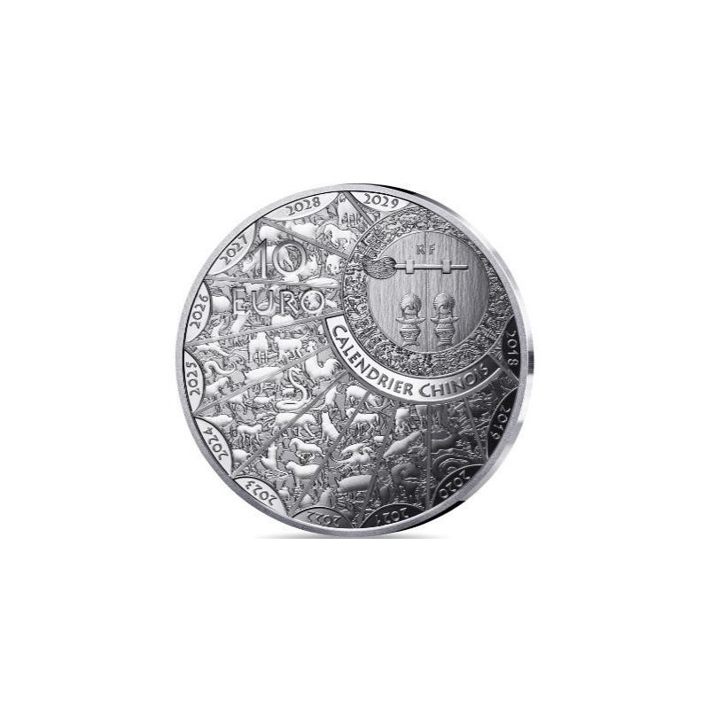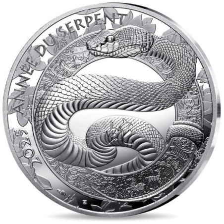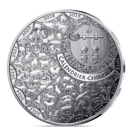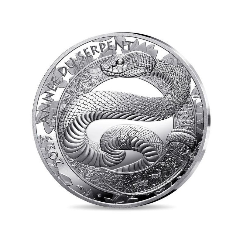 Genau in der Mitte der Vorderseite der Münze windet sich eine Schlange um einen Ring, der mit traditionellen chinesischen Motiven graviert ist. Das Reptil ist in Bewegung, hat sich teilweise um den Ring gewickelt und scheint bereit zu sein, aus dem Münzrand zu entkommen, der mit Orchideen, der mit diesem Zeichen assoziierten Blume, geschmückt ist. Das Gefühl der Ruhe, das von der Darstellung der Schlange ausgeht, verweist direkt auf eines der Hauptmerkmale der Eingeborenen dieses Zeichens. Das Ideogramm "Schlange" erscheint auf einer der Kurven ihres Körpers. Die Jahreszahl 2025 und die Inschrift "Jahr der Schlange" erscheinen auf dem Umriss des Motivs. Auf der Rückseite sind alle Tiere des chinesischen Tierkreises abgebildet. Sie sind alle auf einem Schirm abgebildet, der eine traditionelle chinesische Tempeltür umgibt. Ein kompletter Zyklus des chinesischen Tierkreises wird von 2018 bis 2029 gebildet. Jedes dieser zwölf Jahre zeigt also ein Tier aus diesem Kalender. Der Nennwert ist oben links zu sehen und der Hinweis "RF" befindet sich auf der Tür.