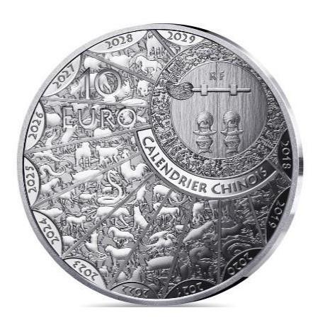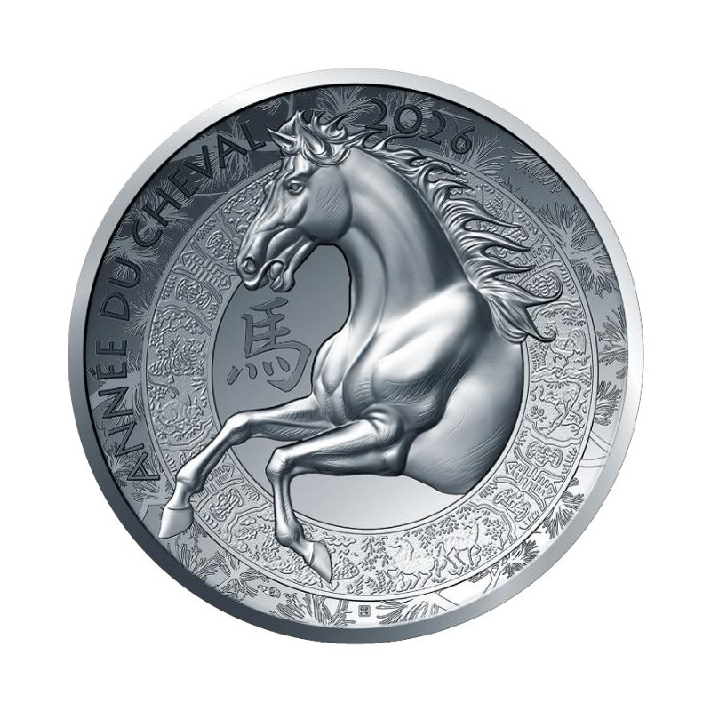 In the centre of the coin face, a horse is galloping. It appears to be crossing a ring engraved with traditional Chinese motifs. The moving horse recalls the characteristics of the natives of this sign: energy, independence and passion. The year 2026 and the inscription ‘Year of the Horse’ appear on the outlines of the design. The reverse features all the animals of the Chinese zodiac on a screen surrounding a traditional temple door. A complete cycle of the Chinese zodiac begins in 2018 and lasts until 2029. Each of the twelve years in this period is represented by one of the zodiac animals. The face value can be seen in the top left-hand corner, and the word ‘RF’ can be seen on the door.