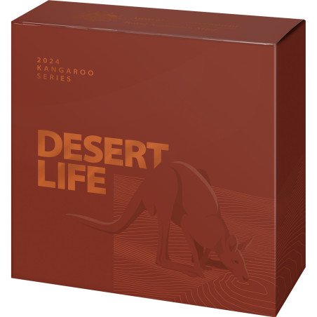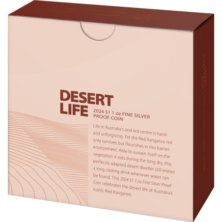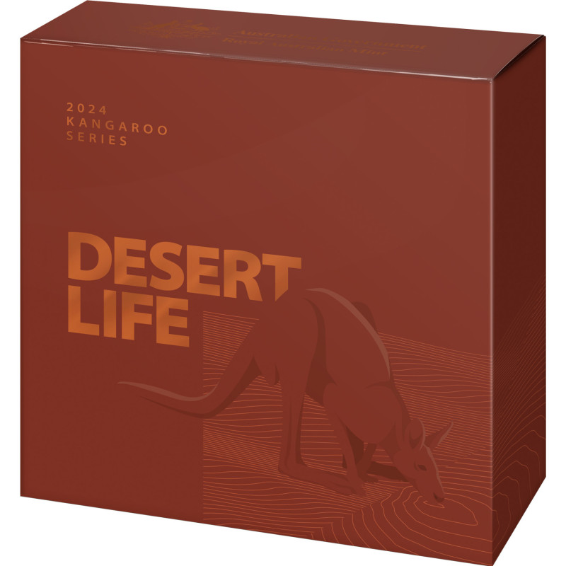 Die Royal Australian Mint präsentiert mit Stolz Desert Life, die einunddreißigste Ausgabe ihrer Känguru-Serie, die das ikonische Rote Känguru und seine Heimat im trockenen roten Zentrum Australiens feiert. Die Rückseite zeigt ein Känguru, das an einer Wasserstelle in der Wüste einen erfrischenden Schluck nimmt. Die klaren Farbtöne dieser 2024 $1 Feinsilber Proof-Münze fangen die schimmernde Oberfläche des kühlen Wassers perfekt ein, während die detaillierten Polituren und Mattierungen das Tier von seiner rauen Wüstenumgebung abheben. Das Leben in der Wüste ist rau und unbarmherzig, doch das Rote Känguru hat sich an diese Umgebung angepasst und kann lange Zeit ohne Wasser auskommen. Wenn es jedoch Wasser findet, genießt dieser Wüstenbewohner einen langen kühlenden Schluck.