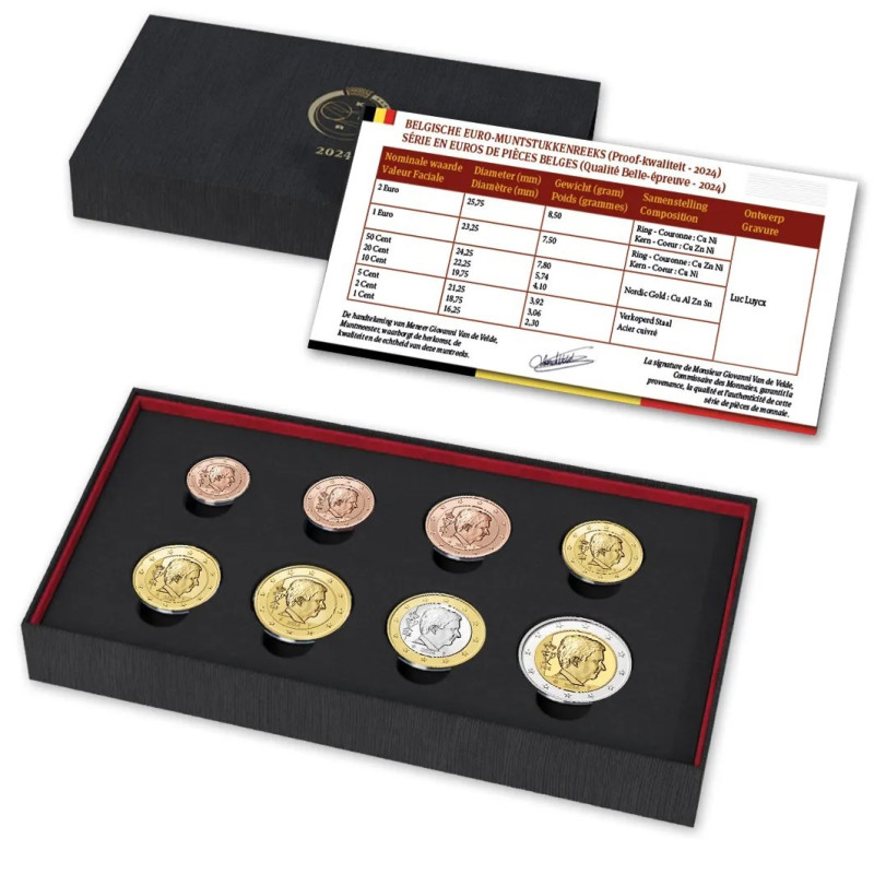 Seit 2002 gibt die Königliche Münze Belgiens jährlich das "Proof-Set Belgien" heraus, das alle Euro-Münzen in Proof-Qualität enthält. Die acht Euro-Münzen werden sicher und stilvoll in einem luxuriösen Sammleretui präsentiert, dem ein Echtheitszertifikat beigefügt ist. Jede Münze ist außerdem in einer transparenten Schutzkapsel verpackt.