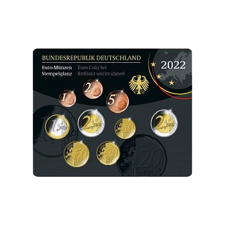 Der Kursmünzensatz Deutschland 2022 enthält Münzen mit Nennwerten von 1 Cent bis 2 Euro. Die Münzen werden in der Prägequalität "Brilliant Uncirculated" geprägt. Der Kursmünzensatz ist in den offiziellen Blisterverpackungen erhältlich.