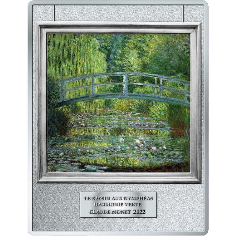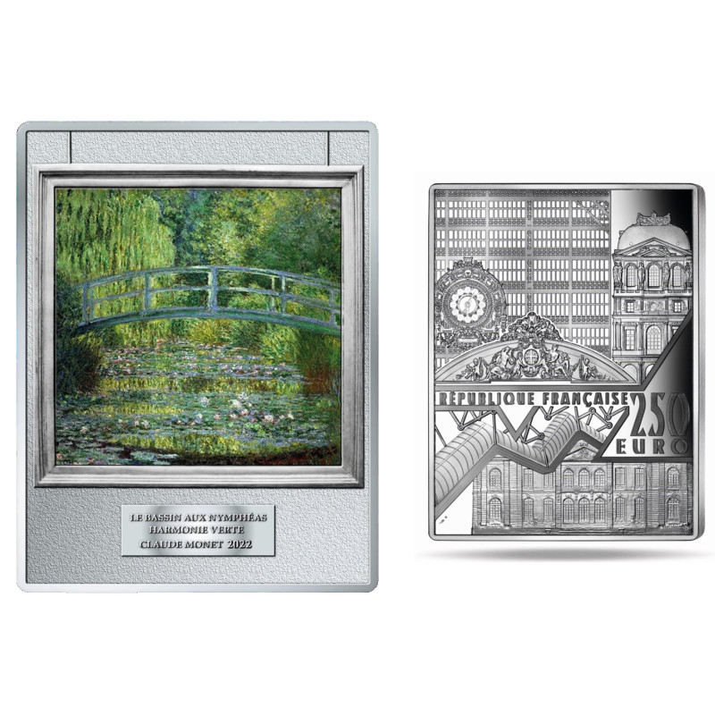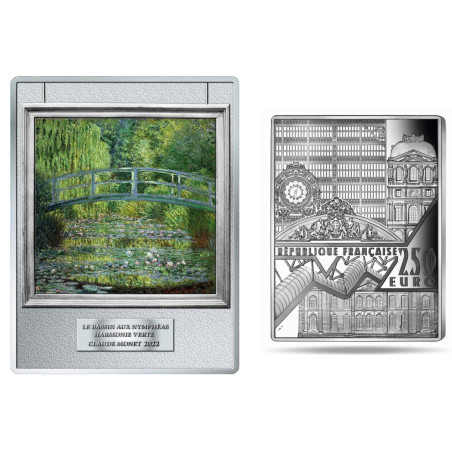 Diese einzigartige 250-Euro-Gedenkmünze aus Frankreich ist eine beeindruckende Hommage an eines der berühmtesten Meisterwerke des französischen Malers Claude Monet: Der Seerosenteich mit japanischer Brücke. Die hochwertige Münze besteht aus 0,5 Kilogramm Silber und wird in höchster Prägequalität geprägt: Proof.