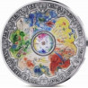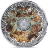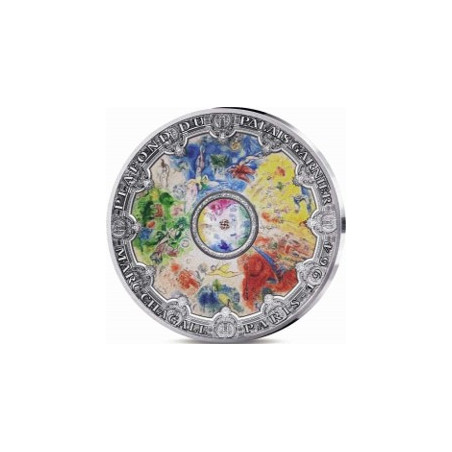 On the obverse of these coloured coins is Marc Chagall's fresco for the ceiling of the main auditorium of the Garnier opera house, commissioned by André Malraux and inaugurated in 1964. The central medallion on the coin is not usually visible to visitors to the Palais Garnier, as it is hidden by the great chandelier that lights up the auditorium. The reverse depicts Jules-Eugène Lenepveu's 1872 work LesMusesetlesheuresdujouretdela nuit. The face value of the coin and the name "République Française" (French Republic) appear in the centre of the composition, in the style and position of the grille that once supported the large chandelier. For each composition, the décor surrounding the work is a reproduction of the mouldings that adorn the real ceiling. The name of each artist and the year in which the work was presented are inscribed on these ornaments.