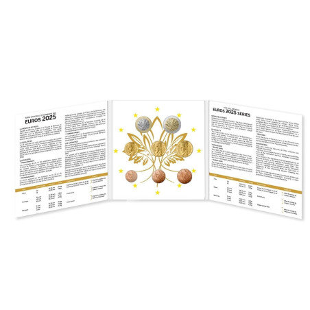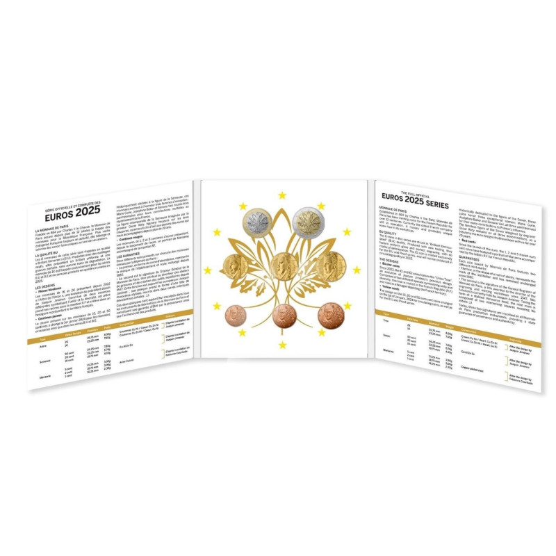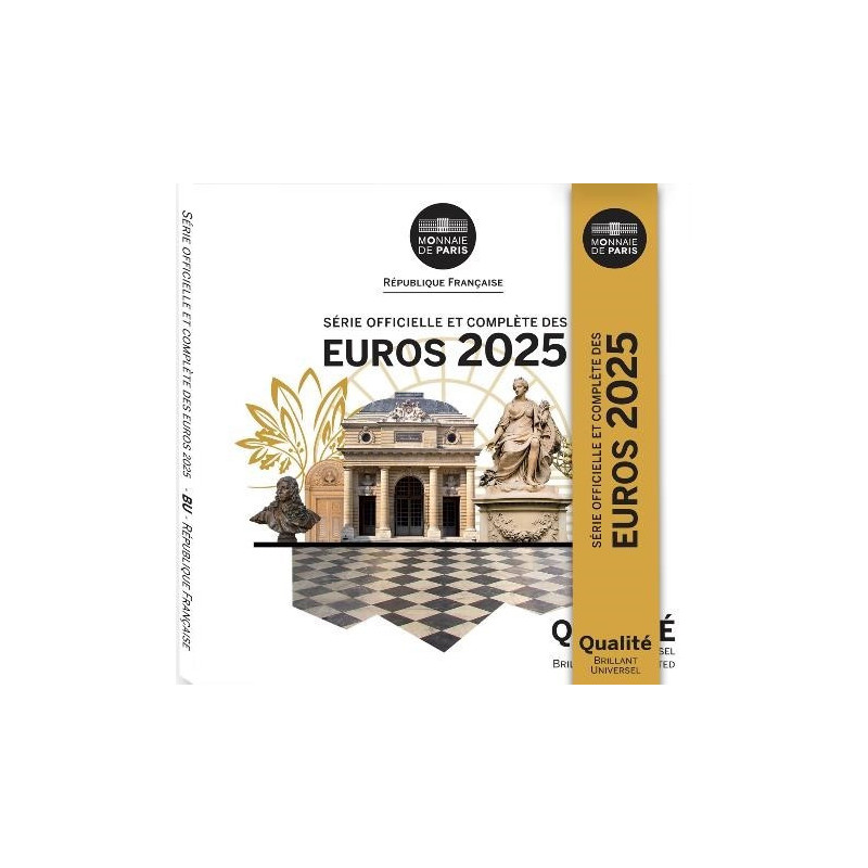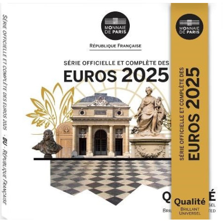 This official series contains the eight French circulation coins in Brilliant Uncirculated (BU) quality. Celebrating the 250th anniversary of the Hotel de la Monnaie, the series features emblematic decorative and architectural elements of the building. The €1 coin is struck exclusively for the BU and BE series and will not be struck in circulating quality in 2025.