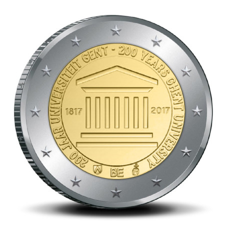Auf der Vorderseite ist das Logo der Universität Gent zu sehen, darunter die Jahreszahlen 1817 - 2017, umgeben von der Inschrift 200 JAAR UNIVERSITEIT GENT und der Länderangabe BE. Das Münzzeichen von Brüssel, ein behelmter Kopf des Erzengels Michael, und das Münzzeichen der Münzdirektoren, das Wappen der Gemeinde Herzele, befinden sich jeweils rechts und links der Länderangabe.