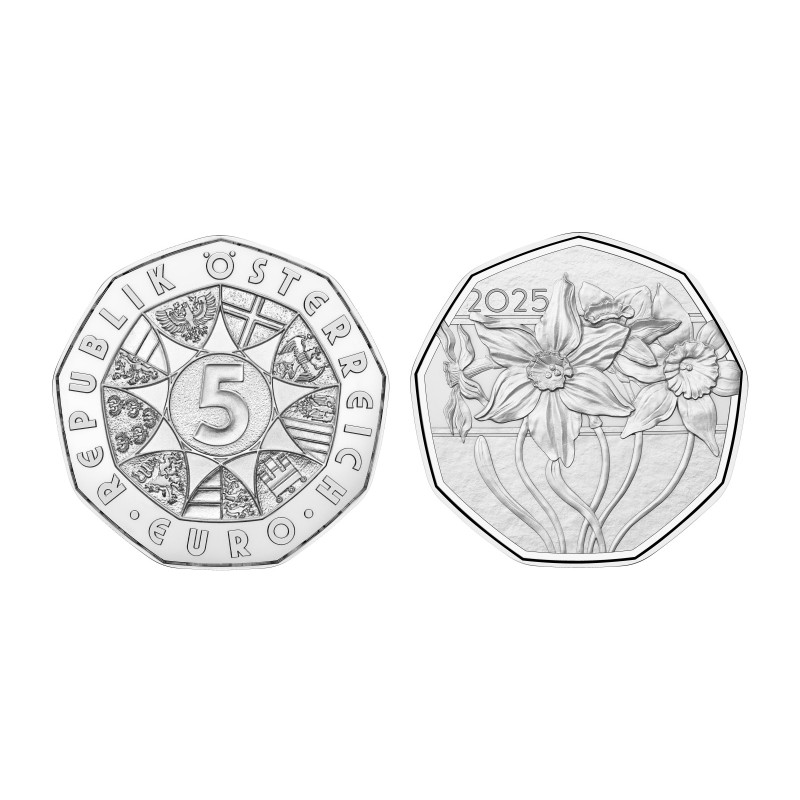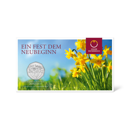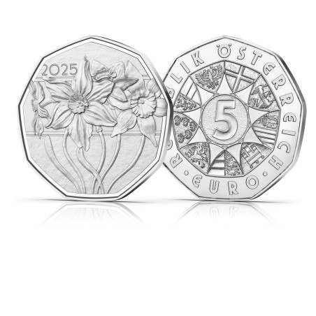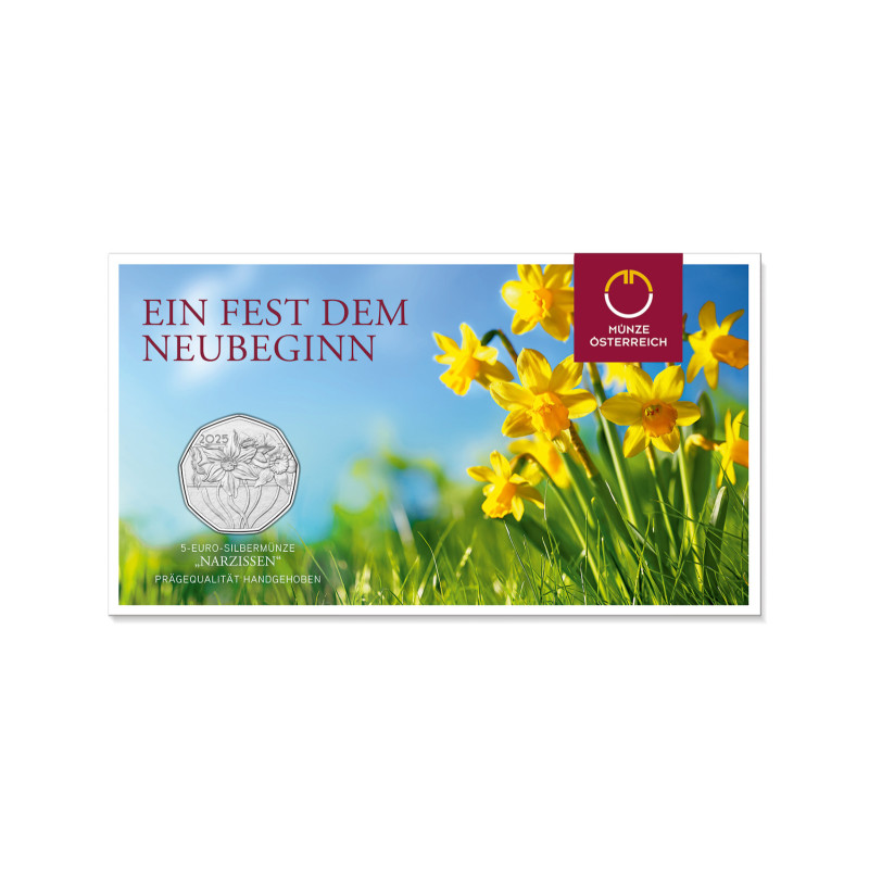 Die fantastische Blüte der Narzissen ist ein unübersehbares Spektakel, das den Frühling mit einer prächtigen Farbenpracht ankündigt. Ein Feld voller Narzissenblüten erhellt die Landschaft und unsere Stimmung, symbolisiert Licht, Hoffnung und Lebensfreude und ist ein starkes Symbol für den Neubeginn. In Österreich wachsen drei Narzissenarten, die bekannteste ist die Sternnarzisse, die im Frühjahr die saftigen Bergwiesen des Landes schmückt. Die beiden anderen Arten sind die beliebten Gartenblumen, die weiße Narzisse, die auch als Dichternarzisse bezeichnet wird, und die gelbe Narzisse, die auch als wilde Narzisse oder Fastenlilie bekannt ist. Die Münze wurde in der exquisiten Qualität Special Uncirculated geprägt und zeigt alle drei Blumen - eine tägliche Erinnerung daran, dass jeder Moment eine neue Gelegenheit ist, etwas Wunderbares zu beginnen.
