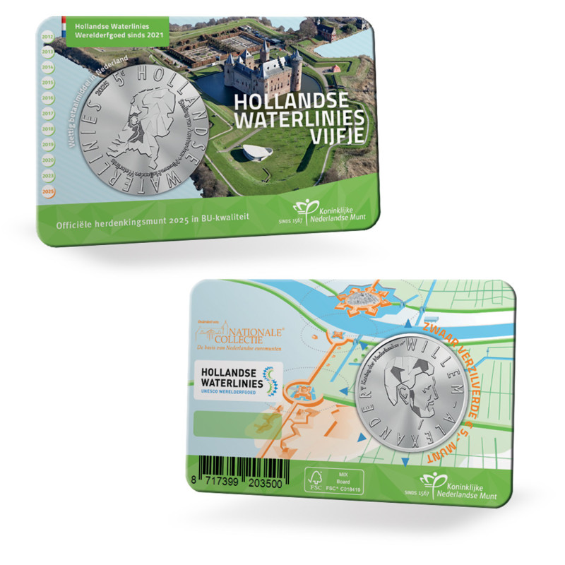 200 Kilometer Länge, 96 Forts, 2 Schlösser, 6 Festungen und mehr als 100 militärische Schleusen, Deiche und Grachten. Die Rede ist natürlich von den niederländischen Wasserverteidigungslinien! Um die Bedeutung des Erbes zu unterstreichen, bringt die Königliche Münze der Niederlande Gedenkmünzen in der UNESCO-Welterbe-Serie heraus. Die 11. Ausgabe, die Dutch Water Defence Lines, wird im Jahr 2025 erscheinen. Speziell für dieses einzigartige Erbe bringt die Königliche Münze der Niederlande im Auftrag des niederländischen Finanzministeriums eine Gedenkmünze heraus.