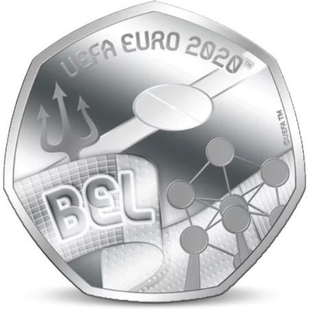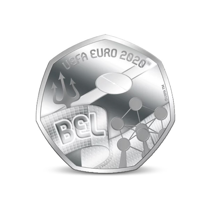 Diese Münze zeigt eine wehende belgische Flagge und die Abkürzung BEL. Außerdem sind das Monument Atomium und ein Bild des Dreizacks zu sehen, eine Anspielung auf die belgische Fußballmannschaft, die Red Devils.