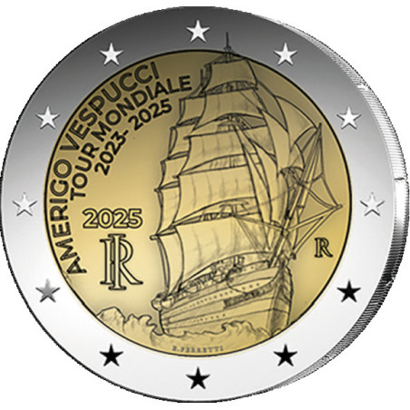 A numismatic masterpiece celebrates the conclusion of the world tour of the legendary Amerigo Vespucci, ambassador of Italian maritime excellence. Obverse: In the centre, the depiction of the Amerigo Vespucci Training Ship which, with sails unfurled, surfs the waves of the sea. Arch-shaped, the inscription “Amerigo Vespucci World Tour 2023-2025”; At the bottom left, “2025”, the year of the coin’s issue and “RI”, acronym of the Italian Republic; on the right, “R”, identifying the Mint of Rome; in exergue “E. FERRETTI”, signature of the designer; around, the twelve stars of the European Union.