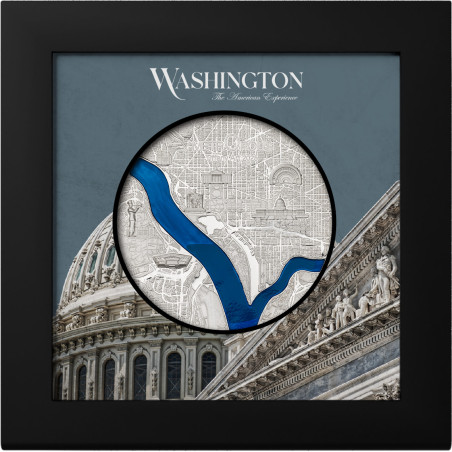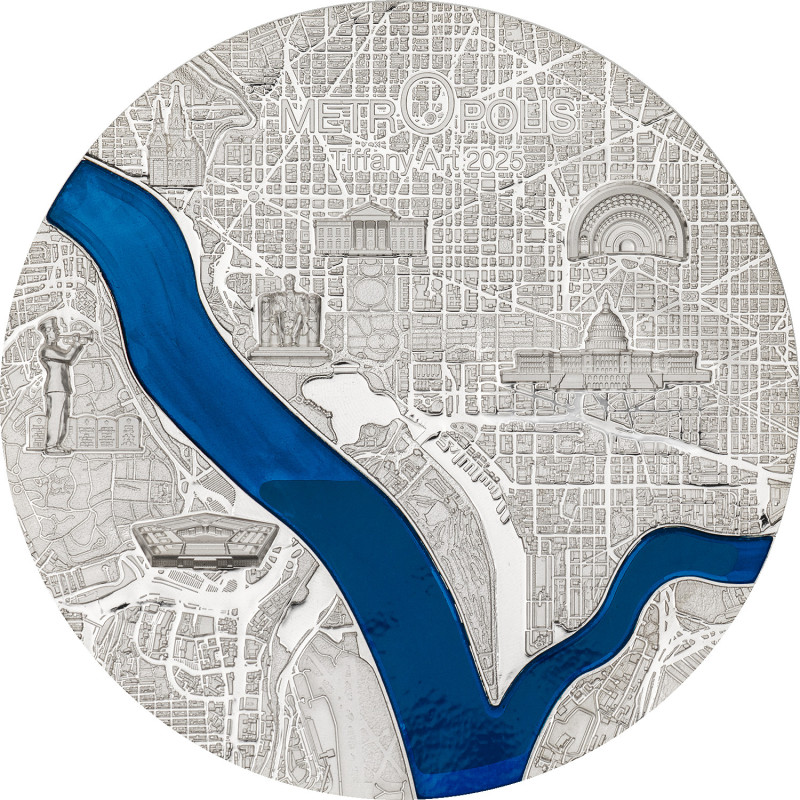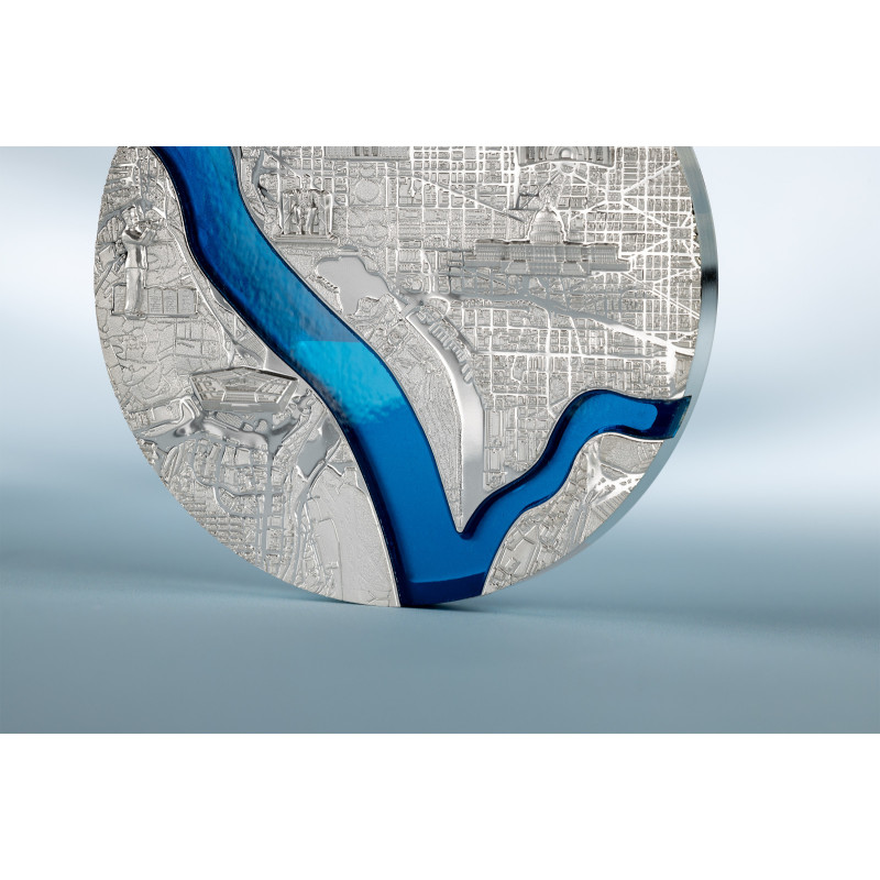 Die Münze zeigt einen sehr detaillierten Ausschnitt des Original-Stadtplans mit polierten Straßen als Kontrast, dem charakteristischen Aussehen der Serie. Die wichtigsten Gebäude der Stadt, wie das Weiße Haus und das Kapitol, sind in ultrahohem Relief dargestellt. Der berühmte Potomac River und der Anacostia River sind auf dieser Münze durch ein integriertes Tiffany-Glasstück abgebildet. Die Vorderseite zeigt die Arlington Memorial Bridge, die 1932 eröffnet wurde und die Einheit zwischen dem Norden und dem Süden der USA nach dem Bürgerkrieg symbolisiert.