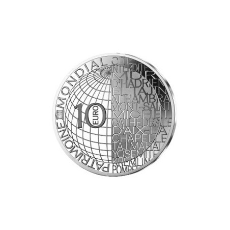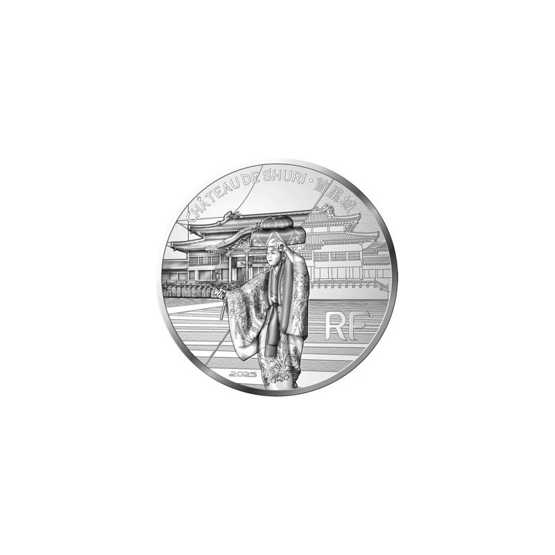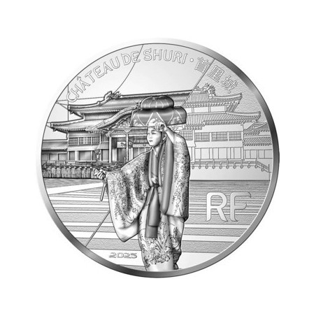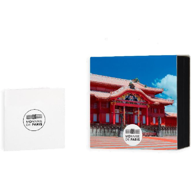 In the foreground, the woman in traditional dress is wearing a richly decorated kimono, typical of the traditional court clothing of the Kingdom of Ryukyu. This outfit is reminiscent of the clothes worn by the nobles or members of the royal family of the kingdom, of which Shuri was the political and cultural centre. The specific headdress was used for important ceremonies, such as royal weddings or state events. In the background, a detailed view of the left-hand side of Shuri Castle and a schematic view of the right-hand side to illustrate its construction/reconstruction. The reverse is common to all the coins in the UNESCO series for 2020. It depicts the globe with parallels and meridians on the left-hand side and inscriptions of major UNESCO World Heritage sites on the right-hand side. The inscriptions are engraved in stone, echoing the Rosetta Stone. The left-hand side of the globe is surrounded by the UNESCO logo and the words "World Heritage". The face value is inscribed on the left-hand side of the globe, blending in perfectly with the parallels and meridians