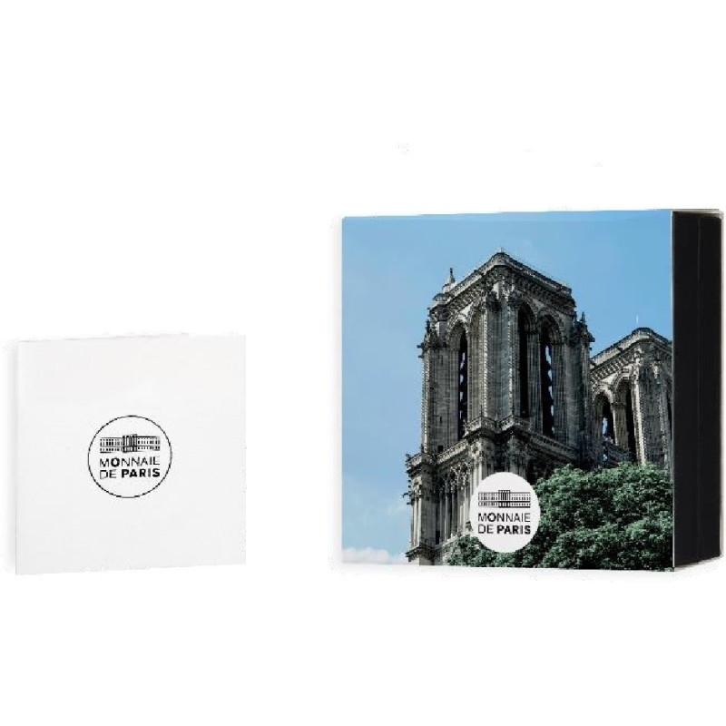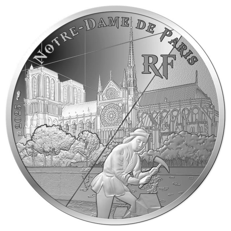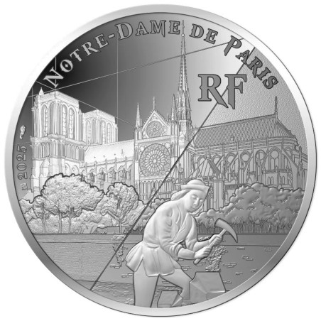 In the foreground, a medieval stonemason symbolising the craftsmen who built the cathedral. In the second plan, the left-hand side of the cathedral in a detailed view and the right-hand side, as well as the spire, in a schematic line of the structure to evoke its construction/reconstruction. The reverse is common to all the coins in the 2020 UNESCO series. It depicts the globe with parallels and meridians on the left-hand side and inscriptions of major UNESCO World Heritage sites on the right-hand side. The inscriptions are engraved in stone, echoing the Rosetta Stone. The left-hand side of the globe is surrounded by the UNESCO logo and the words "World Heritage". The face value is inscribed on the left-hand side of the globe, blending in perfectly with the parallels and meridians.