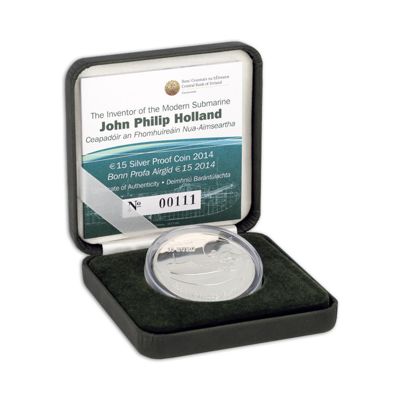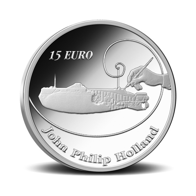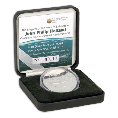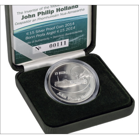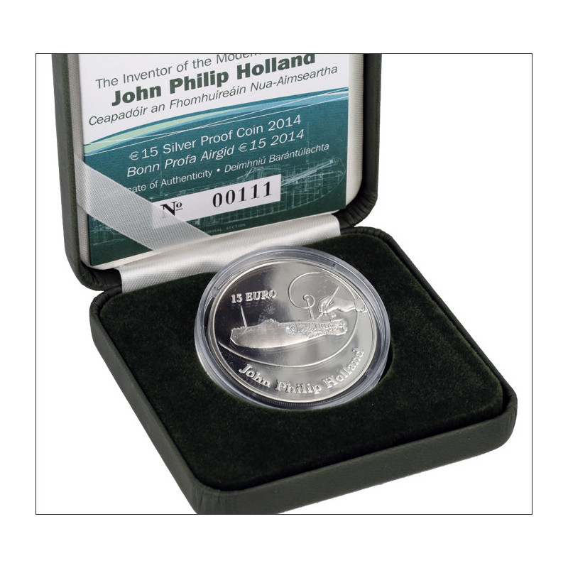 Die irische Zentralbank hat diese einzigartige 15 Euro Gedenkmünze aus Sterling (.925) Silber zu Ehren des irisch-amerikanischen Erfinders John Philip Holland (1841 - 1914) ausgegeben. Er war es, der das erste moderne U-Boot der Vereinigten Staaten entwarf, das nach dem Erfinder benannt wurde: die USS Holland (SS-1). John Philip Holland war nicht nur für das erste U-Boot der Vereinigten Staaten verantwortlich, er entwickelte auch das erste U-Boot für die britische Royal Navy. Dieses wurde Holland 1 genannt.